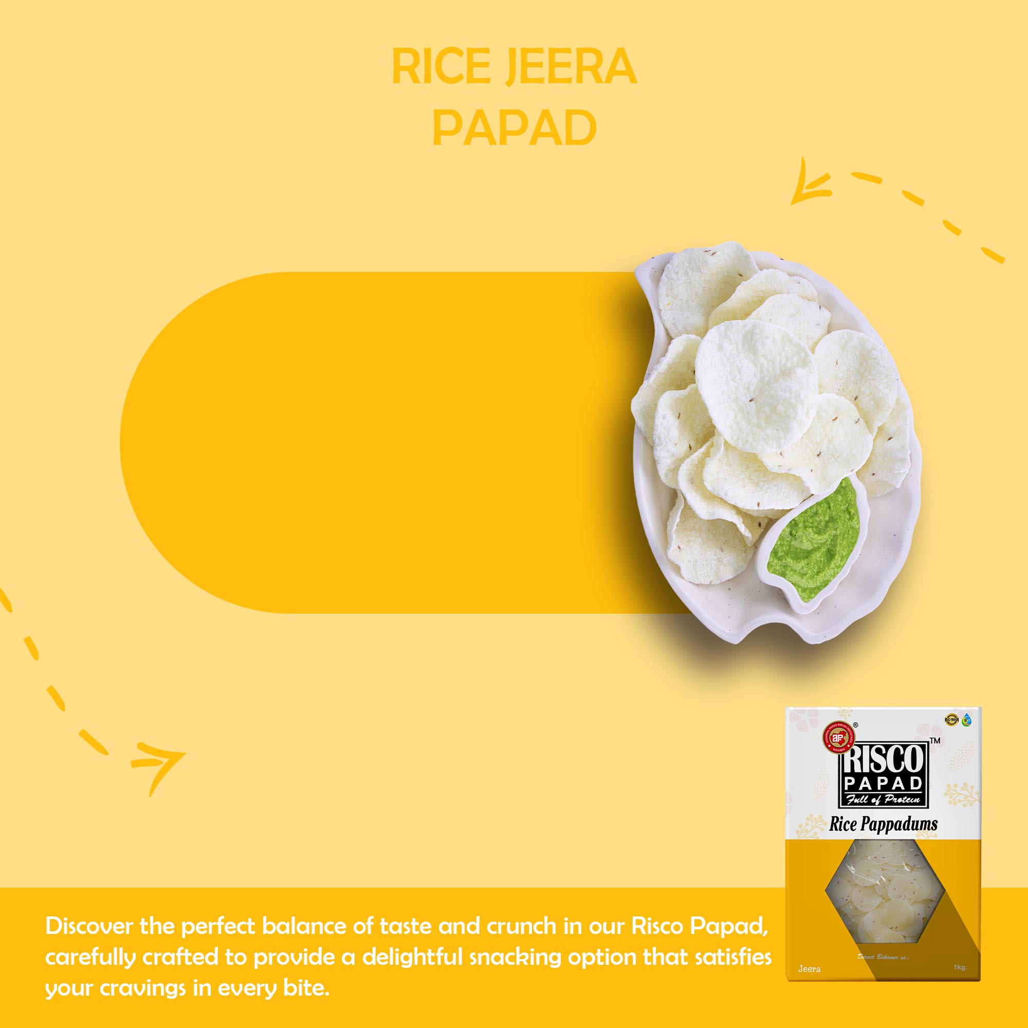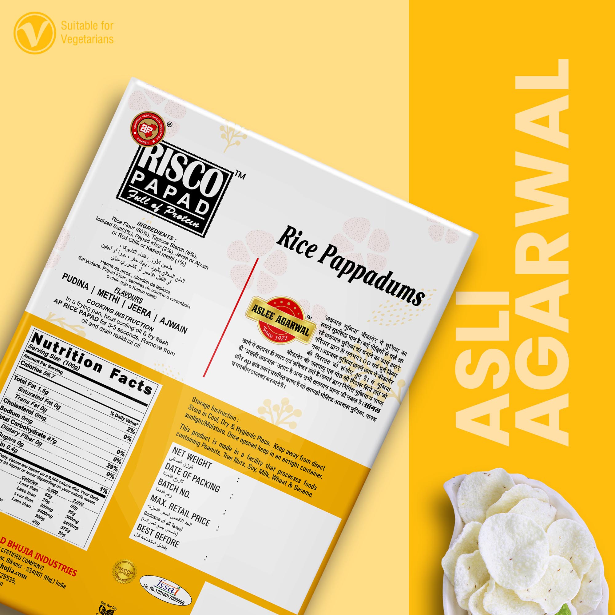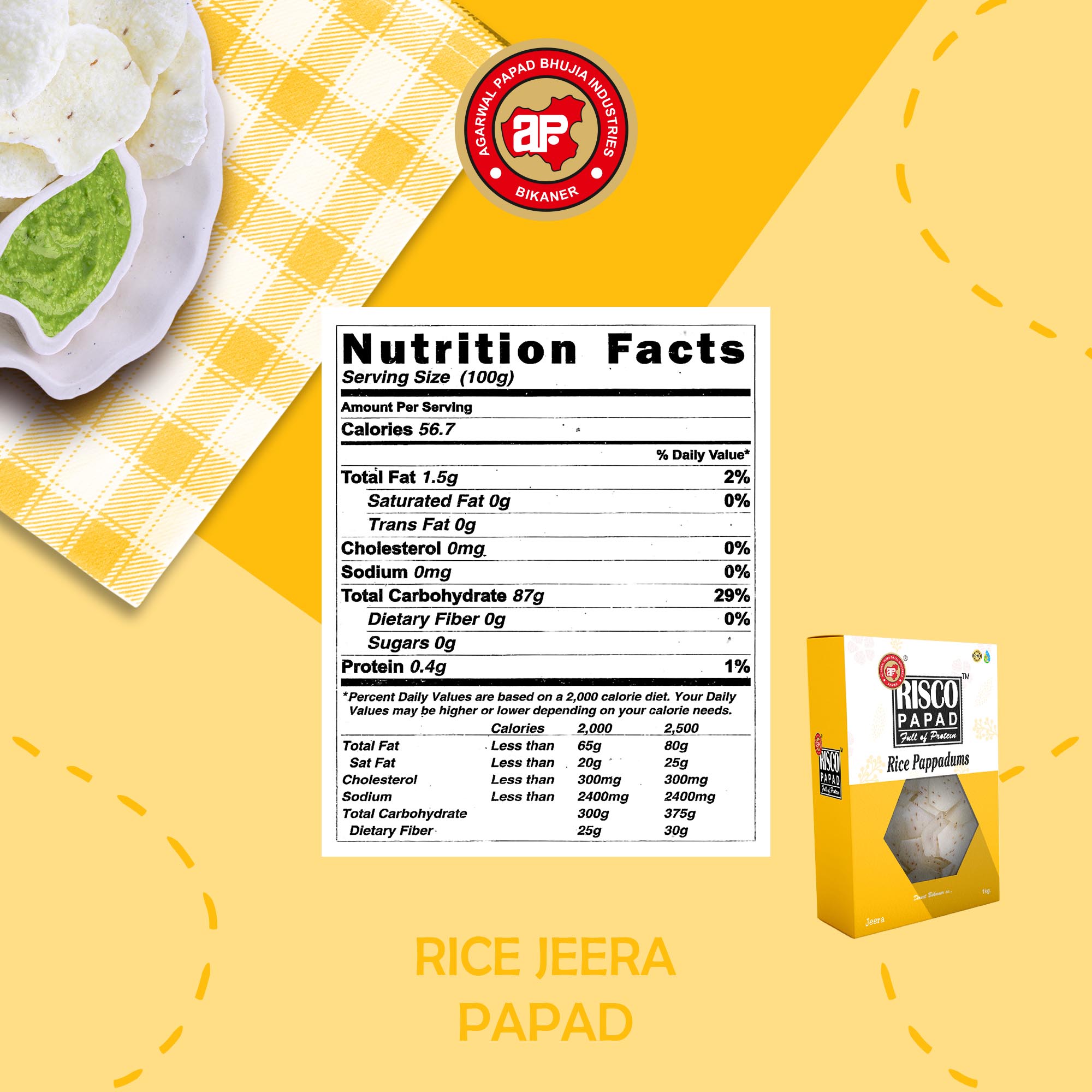 Introducing Jeera Risco Papad by APBI, a delectable and authentic Indian snack that will tantalize your taste buds. Made with a perfect blend of high-quality ingredients, including 80% rice flour, 8% tapioca starch, 3% iodized salt, 2% papad khar, and 1% jeera (cumin), ajvain (carom seeds), red chili, or kasuri methi (dried fenugreek leaves), these papads offer a burst of flavors with every bite. Crafted with care, they are gluten-free and boast a spicy kick that will satisfy your cravings. Thin and crispy, these traditional papads bring the essence of India to your plate. Indulge in this irresistible snack for an authentic culinary experience.