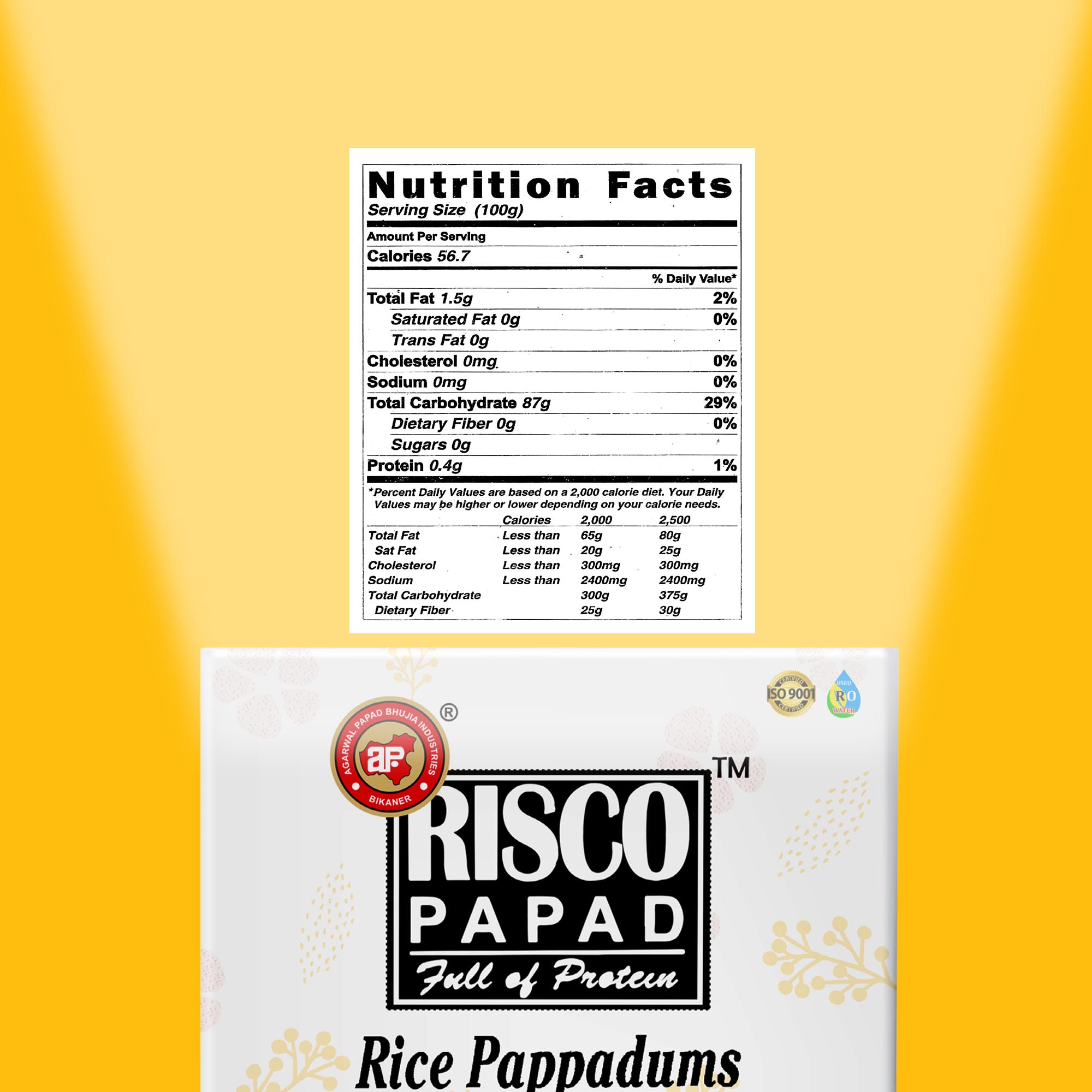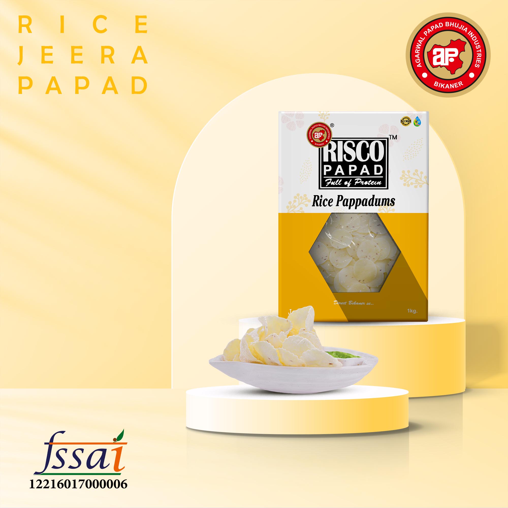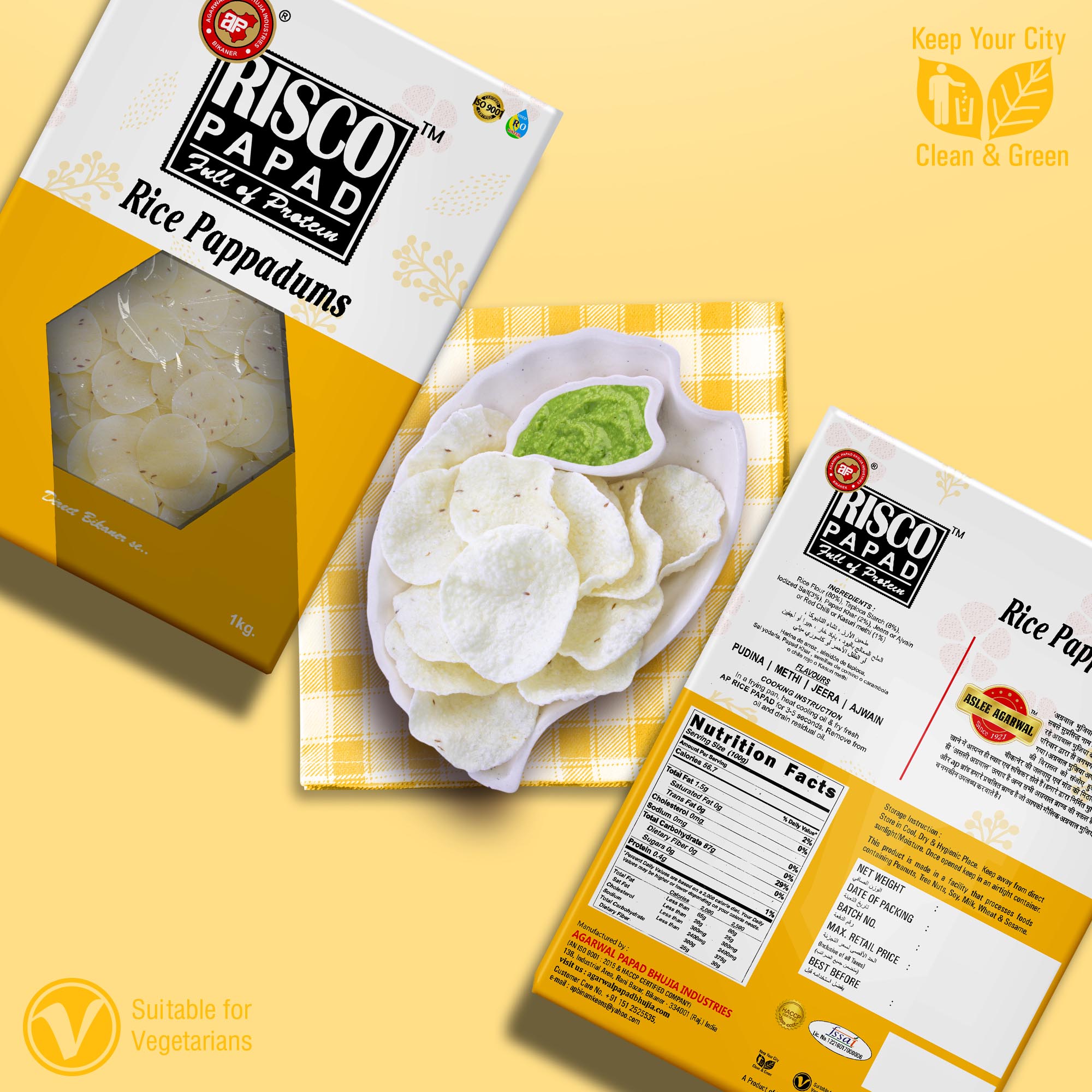 Introducing Jeera Risco Papad by APBI, a delectable and authentic Indian snack that will tantalize your taste buds. Made with a perfect blend of high-quality ingredients, including 80% rice flour, 8% tapioca starch, 3% iodized salt, 2% papad khar, and 1% jeera (cumin), ajvain (carom seeds), red chili, or kasuri methi (dried fenugreek leaves), these papads offer a burst of flavors with every bite. Crafted with care, they are gluten-free and boast a spicy kick that will satisfy your cravings. Thin and crispy, these traditional papads bring the essence of India to your plate. Indulge in this irresistible snack for an authentic culinary experience.